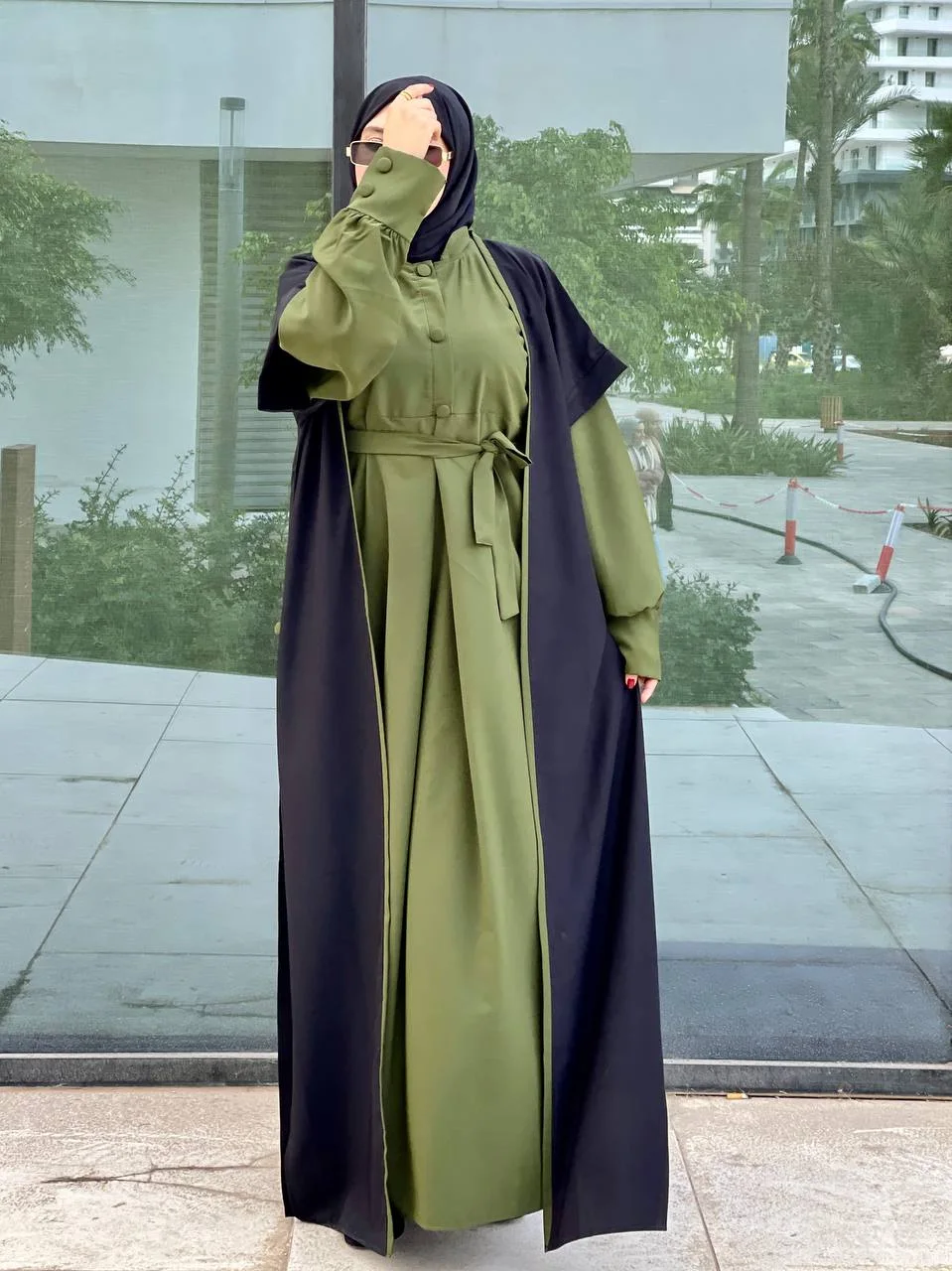 عباية كريب حرير أربع قطع فولار+ عباية بصديف وليبلي + جلي طويل حتى لتحت بصديف فجناب + حزام بلون عباية صور حقيقية
